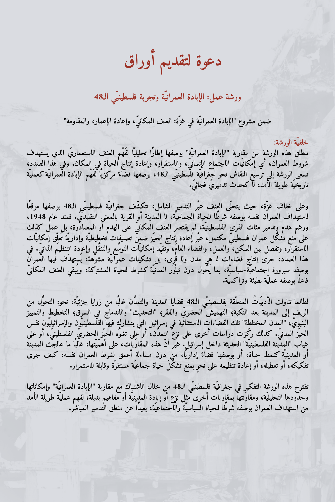 دعوة لتقديم أوراق | ورشة عمل: الإبادة العمرانيّة وتجربة فلسطينيّي الـ48