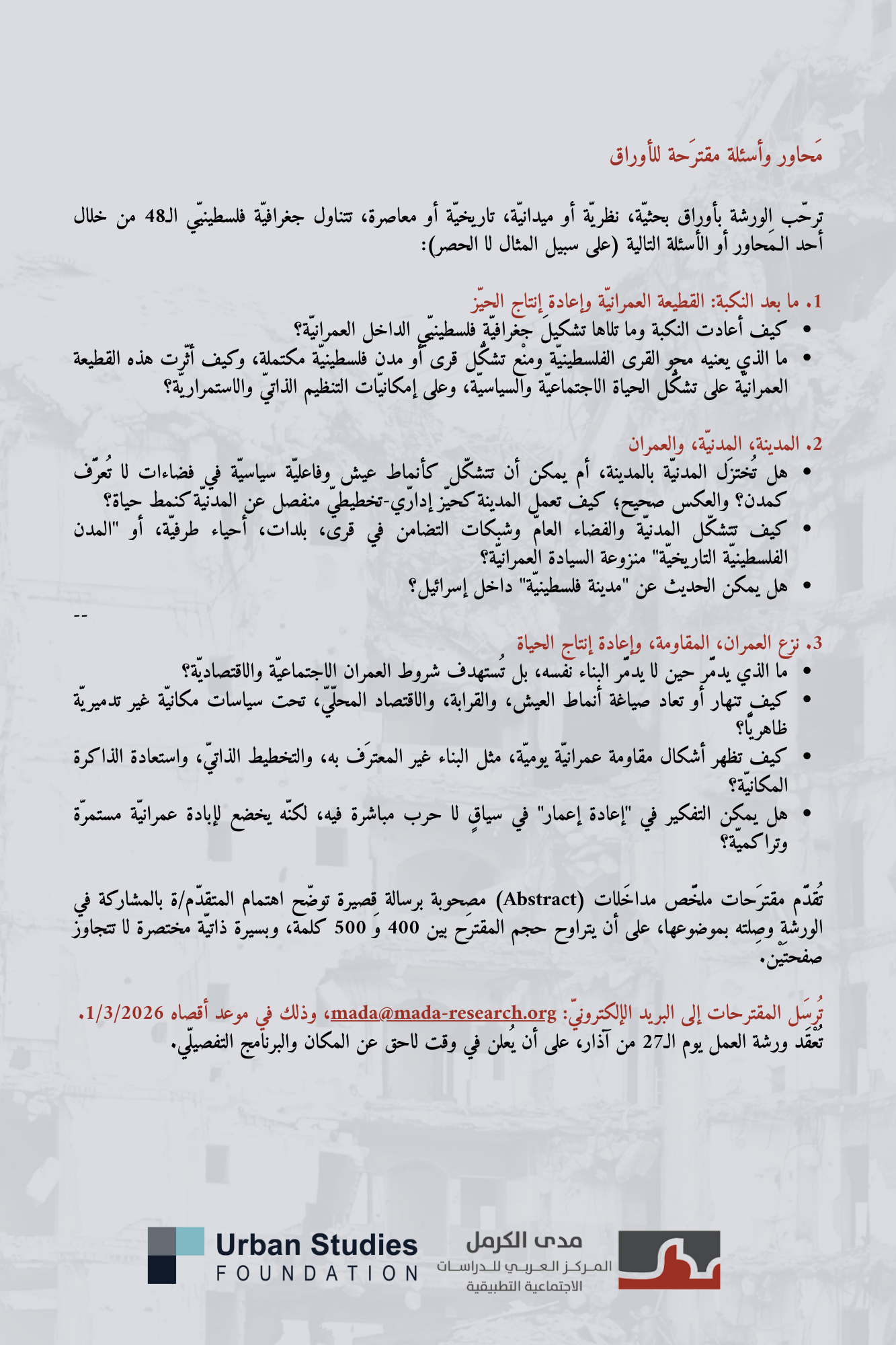 دعوة: ندوة بعنوان "الإبادة العمرانيّة في فلسطين - مقارَبة سوسيولوجيّة وتاريخيّة ومعماريّة" (كانون الثاني 2026)