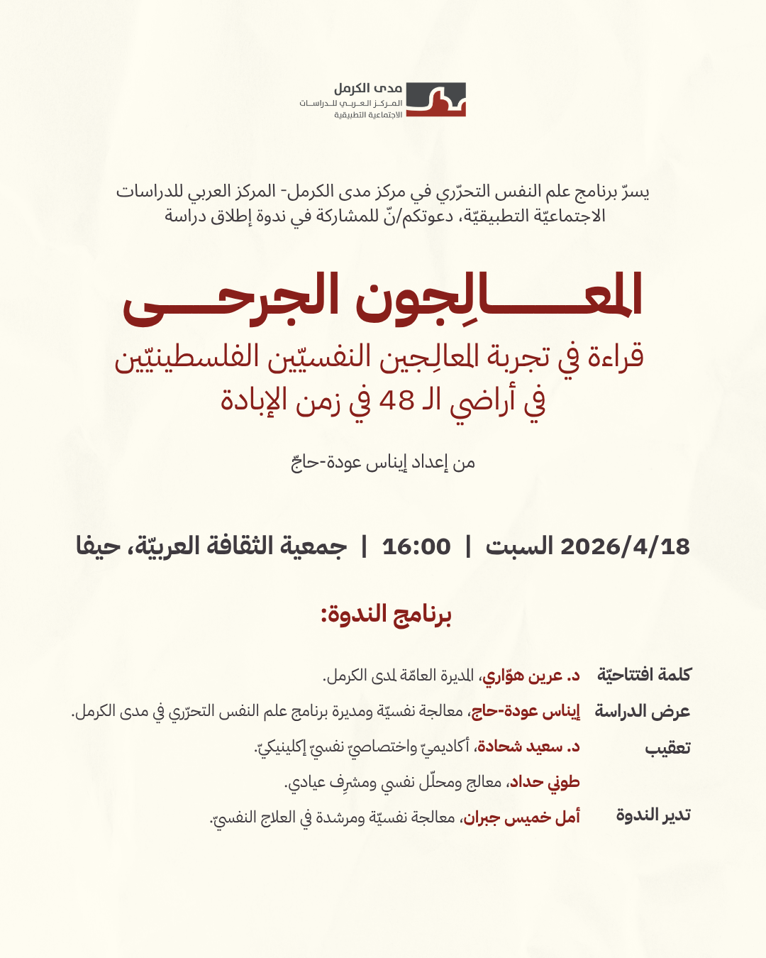 دعوة | إطلاق دراسة "المعالِجون الجرحى: قراءة في تجربة المعالِجين النفسيّين الفلسطينيّين في أراضي الـ 48 في زمن الإبادة"