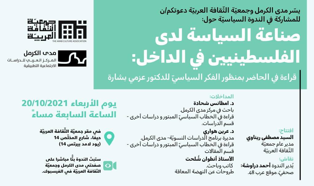 افتتح النّدوة مدير جمعيّة الثقافة العربيّة، مصطفى ريناوي، مرحّبًا بالمشاركين في النّدوة ومتحدّثًا عن صناعة السياسة في الداخل الفلسطيني من خلال التطرق إلى أحد الملفات البارزة والمؤسفة والذي تشهد أحداثا دامية من خلال الجريمة المنظمة وسياسة الشرطة حولها، وارتباط هذا الملف بالتعامل معه في حقيقته كجزء من استمرار النكبة ومطاردة الفلسطيني وسحق قوته في التنظيم لبناء مجتمع ذات تنشئة اجتماعية وسياسية سليمة، في مقابل الحالة السياسية العبثية التي ترى في الهامش السياسي الإسرائيلي مكانا مركزيا للفعل السياسي العربي والذي يحول خطاب الخدمات المشروطة إلى فعل منفصل عن الحالة السياسية العامة .